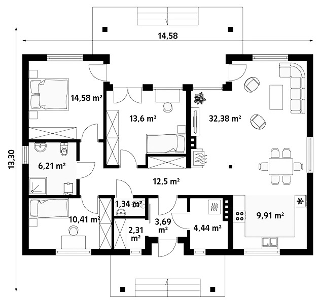Raspored je dodatno obogaćen sa dva funkcionalna kupatila, koja pružaju komfor i privatnost svim članovima porodice. Ostava omogućava diskretno odlaganje kućnih potrepština, dok kotlarnica pruža tehničku podršku doma i doprinosi energetskoj efikasnosti. Sve prostorije povezuje širok hodnik, koji omogućava lako kretanje i dodatno doprinosi osećaju otvorenosti.